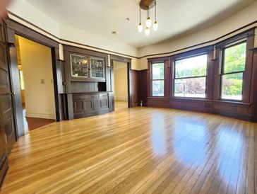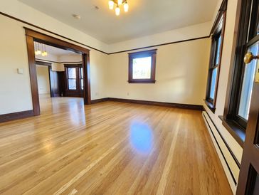 Enter your front door into this beautiful living room. Each living room in the 3-bedroom apartments hail a grand entry into a light-bright room with pocket doors and hardwood floors. The living room leads into the dining room.